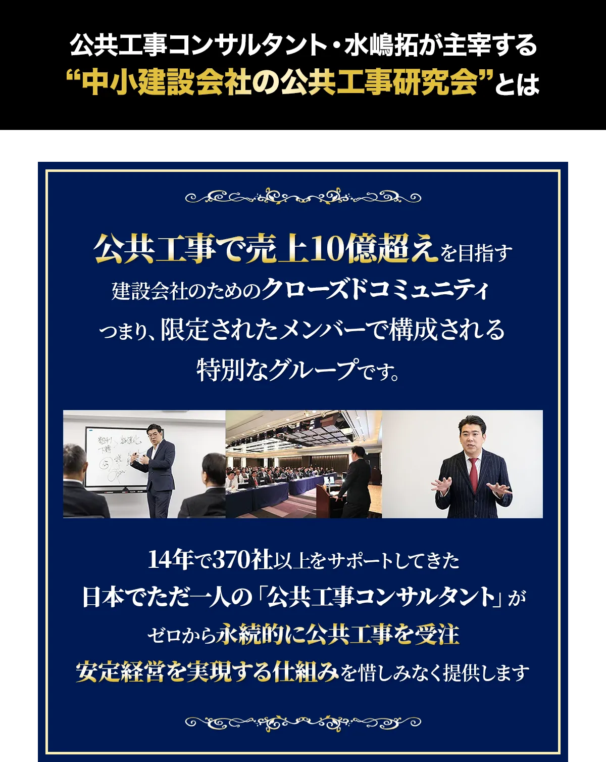 ゼロの状態から公共工事受注の常連になるまでをサポートできる、日本でただ一つのコミュニティとなっています。