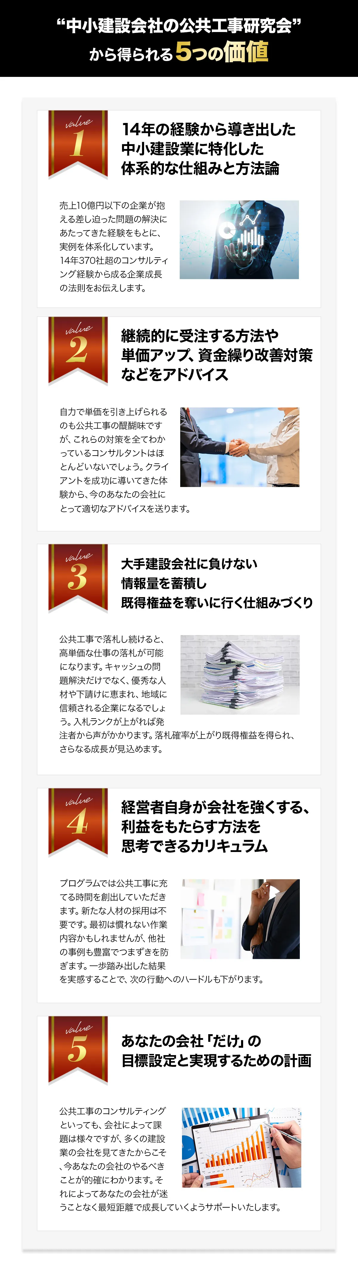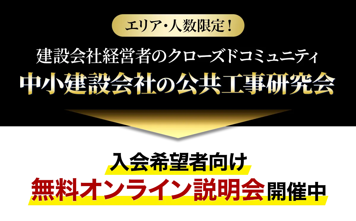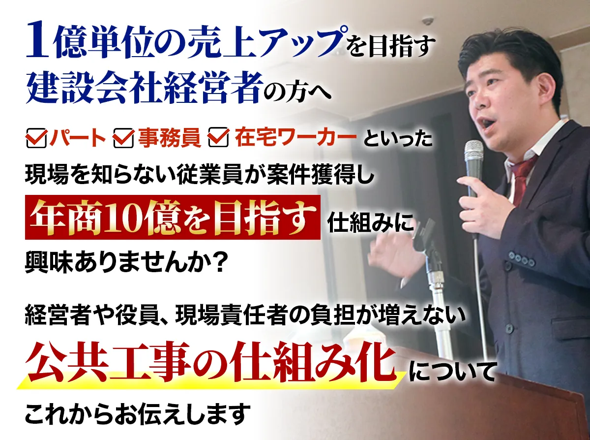 公共工事の「やり方が分からない」人や、自分の事業の「枠から外れようと思う」勇気がある人をはじめ、民間工事に不安を感じている経営者や、建設業をやるなら公共工事で経営を安定させたいと思っている方に最適です。