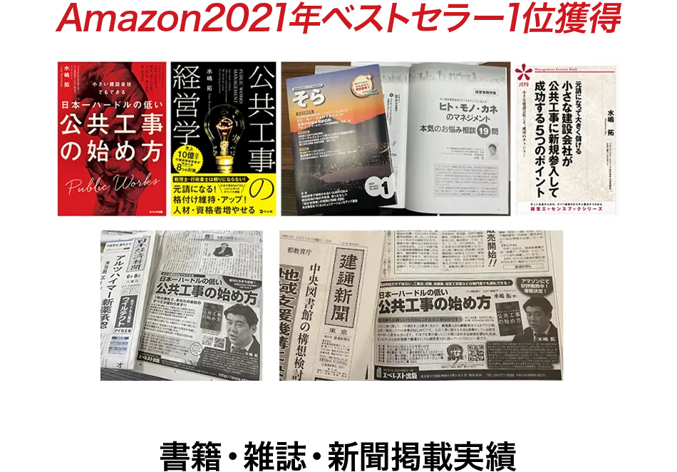 - 書籍「公共工事の始め方」2021年エベレスト出版より出版 Amazonベストセラー1位獲得
