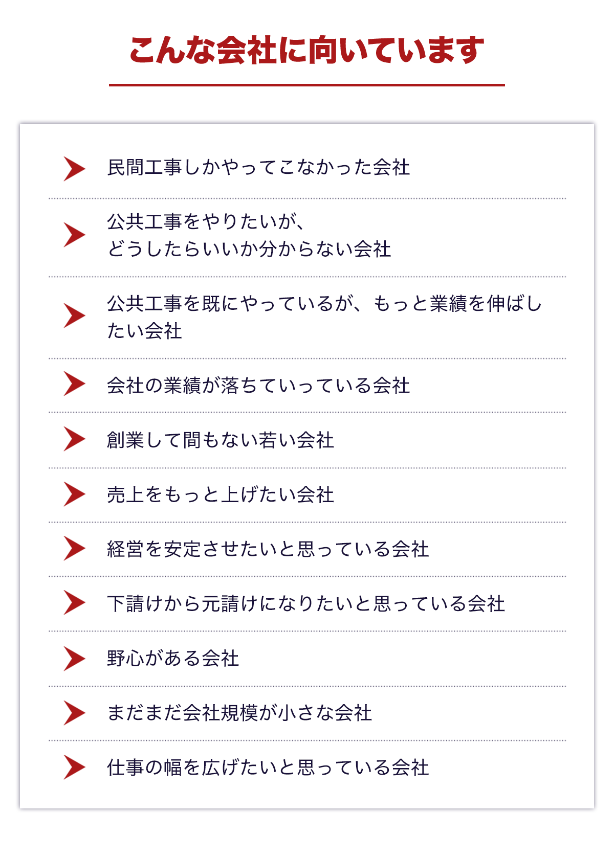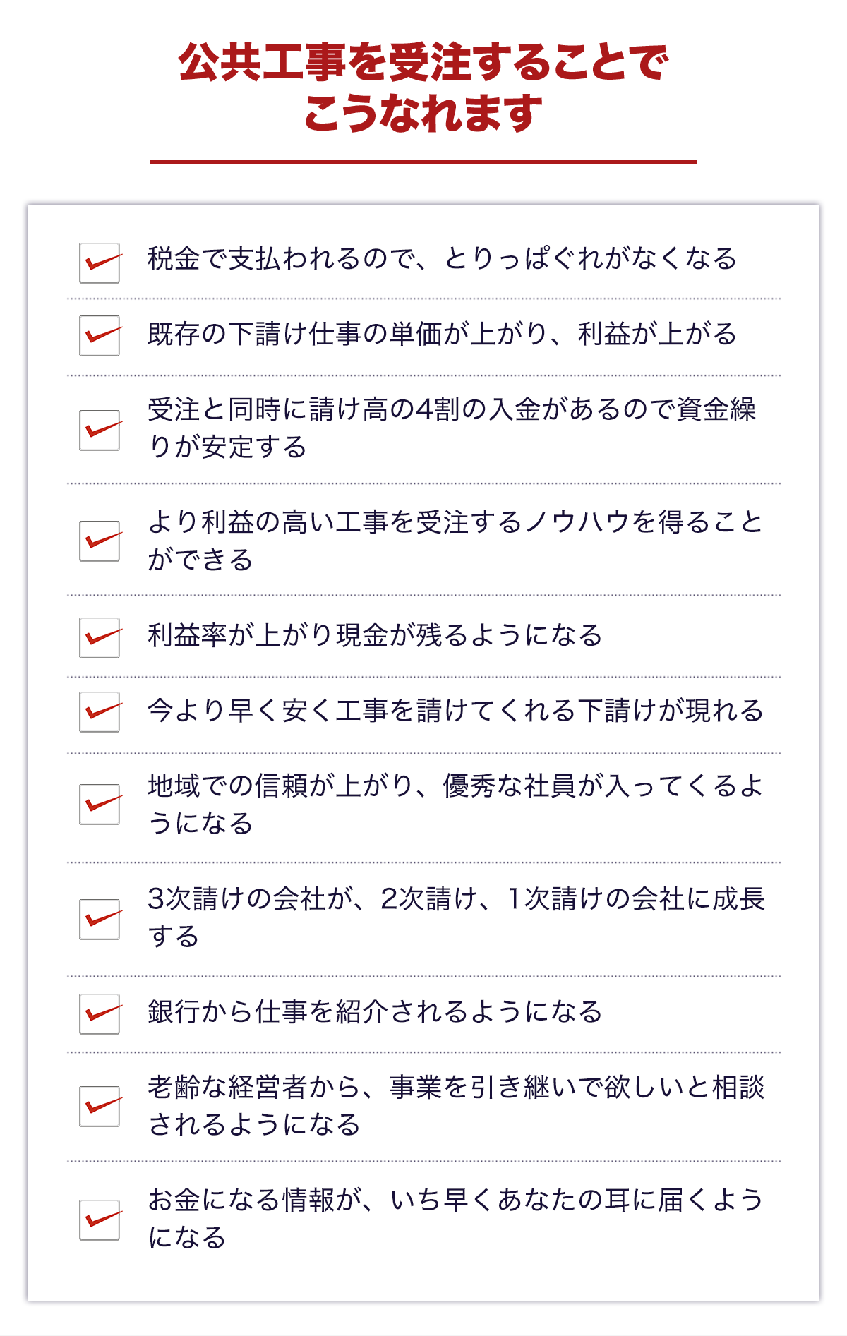 単なる“工事屋さん”ではなく、経営者の楽しさを実感していただくためには、公共工事での成長が最も早く確実なのです。